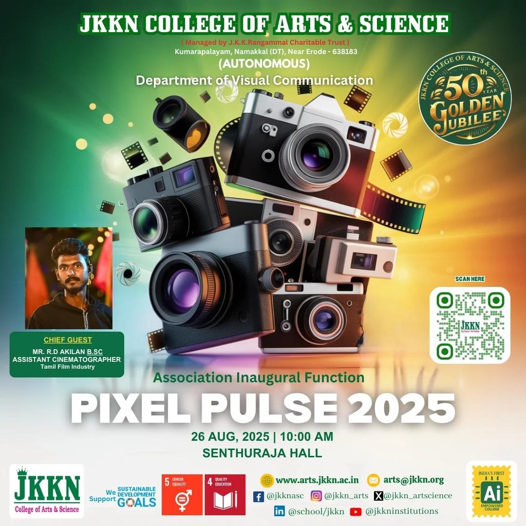 The Department of Visual Communication of JKKN College of Arts & Science (Autonomous) successfully inaugurated its association event “PIXEL PULSE 2025” on 26th August 2025 at Senthuraja Hall. The program marked a vibrant beginning to the academic year’s activities with enthusiastic participation from students, faculty members, and special invitees. The event was graced by the Chief Guest, Mr. R.D. Aikilan, B.Sc., Assistant Cinematographer in the Tamil Film Industry, who shared his professional journey, experiences in cinematography, and valuable insights about the growing opportunities in the field of visual media. His motivational address inspired the students to explore their creativity, stay updated with emerging technologies, and pursue excellence in the visual communication industry. The inaugural function featured engaging sessions, interactive discussions, and presentations that highlighted the significance of creativity, storytelling, and technical skills in shaping future media professionals. Students actively participated and expressed their eagerness to contribute to upcoming association activities and creative projects The event enhanced awareness of career opportunities in cinematography and visual media, encouraged creativity and innovation, strengthened industry–academia linkage through the presence of an eminent professional, and marked the official launch of the Visual Communication Association activities for the academic year 2025–26. The program concluded with a vote of thanks, acknowledging the chief guest, management, faculty members, and students for their valuable support and contribution to the success of PIXEL PULSE 2025, which set a strong foundation for future association initiatives.