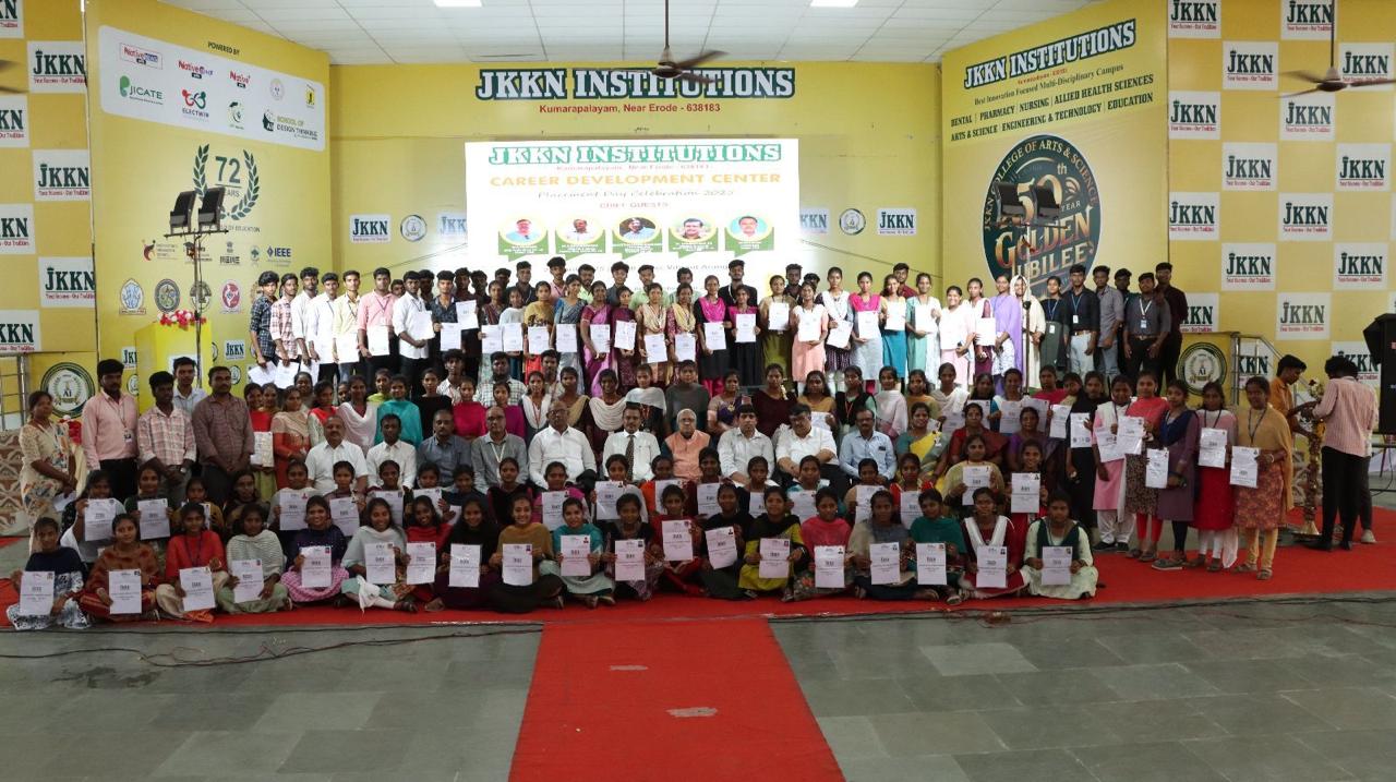 JKK Nattraja Institutions celebrated its Placement Day 2025 on April 25 at Vibrant Arangam, organized by the Career Development Center. The event honored the placement achievements of students and fostered connections with industry professionals and alumni. Distinguished guests, including alumni such as Dr. Prakash Palanivelu (MSR Tooth Clinic Pvt. Ltd., 1996) and Dr. Jaganathan KS (Serum Institute of India Pvt. Ltd., 1998), shared insights on career development and industry expectations. The Career Development Center presented a report highlighting successful placements across various departments, with over 139 students securing positions in reputed companies like Foxconn, Premier Fine Linens, Sakthi Auto Components, Rinex Technologies, and Pronoia EduTech. The B.Sc (Computer Science) department led with 59 placements, followed by B.Com (CA) with 36. Students received their offer letters during the event, which also featured interactive sessions fostering mentorship opportunities. The celebration underscored the institution’s commitment to career excellence, alumni engagement, and industry collaboration, enhancing its reputation in academic and professional circles.